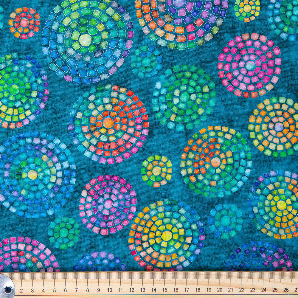 A batik-style, multicoloured mosaic tile pattern on a blue/green background. Beautiful, high quality, printed cotton fabric. Ideal for quilting, masks, crafts, displays, table decoration and as a dressmaking fabric.