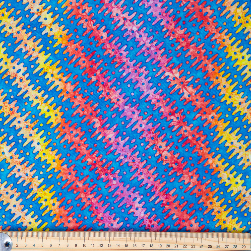 A multicoloured, soundwave stripe pattern on a mid blue background. Beautiful, high quality, printed cotton fabric. Ideal for quilting, masks, crafts, displays, table decoration and as a dressmaking fabric.