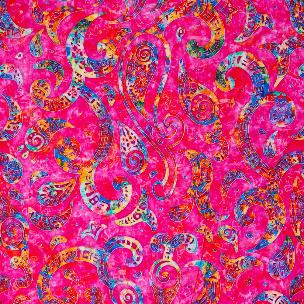 A batik-style multicoloured pattern on a hot pink background. Beautiful, high quality, printed cotton fabric. Ideal for quilting, masks, crafts, displays, table decoration and as a dressmaking fabric.