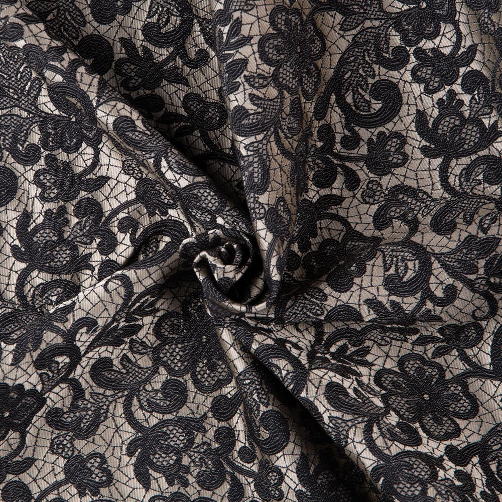 Step back in time with this vintage-inspired lace brocade. A guipure floral lace effect curls around a champagne background. We see bodices and circle skirts paired with lustrous satins. Opaque, a lining may be added for comfort.