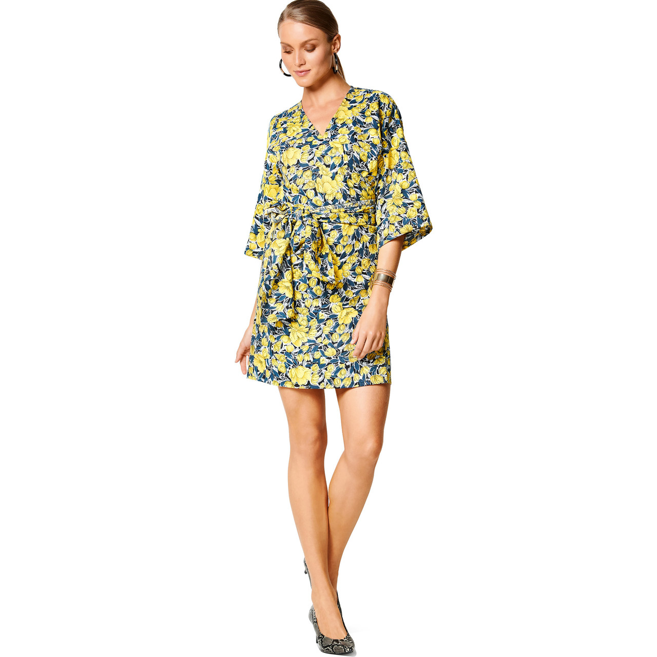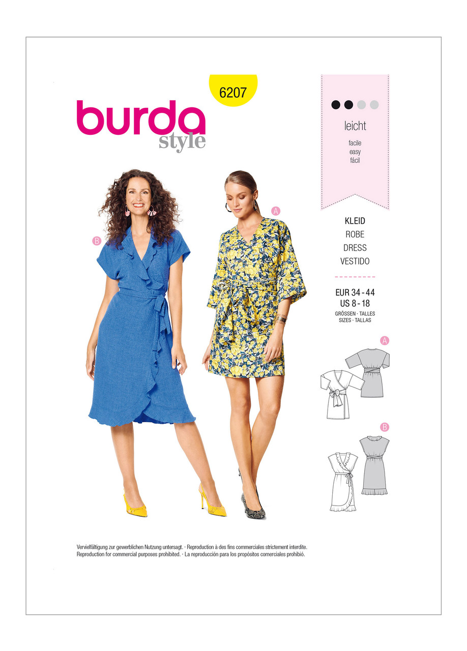 Here are different takes on the ever so feminine wrap dress. Both styles feature over-cut shoulders. The 3/4-sleeves and wide tie bands of view A are reminiscent of kimono style. Dress view B with its pleasing flounces is a fanciful variation.