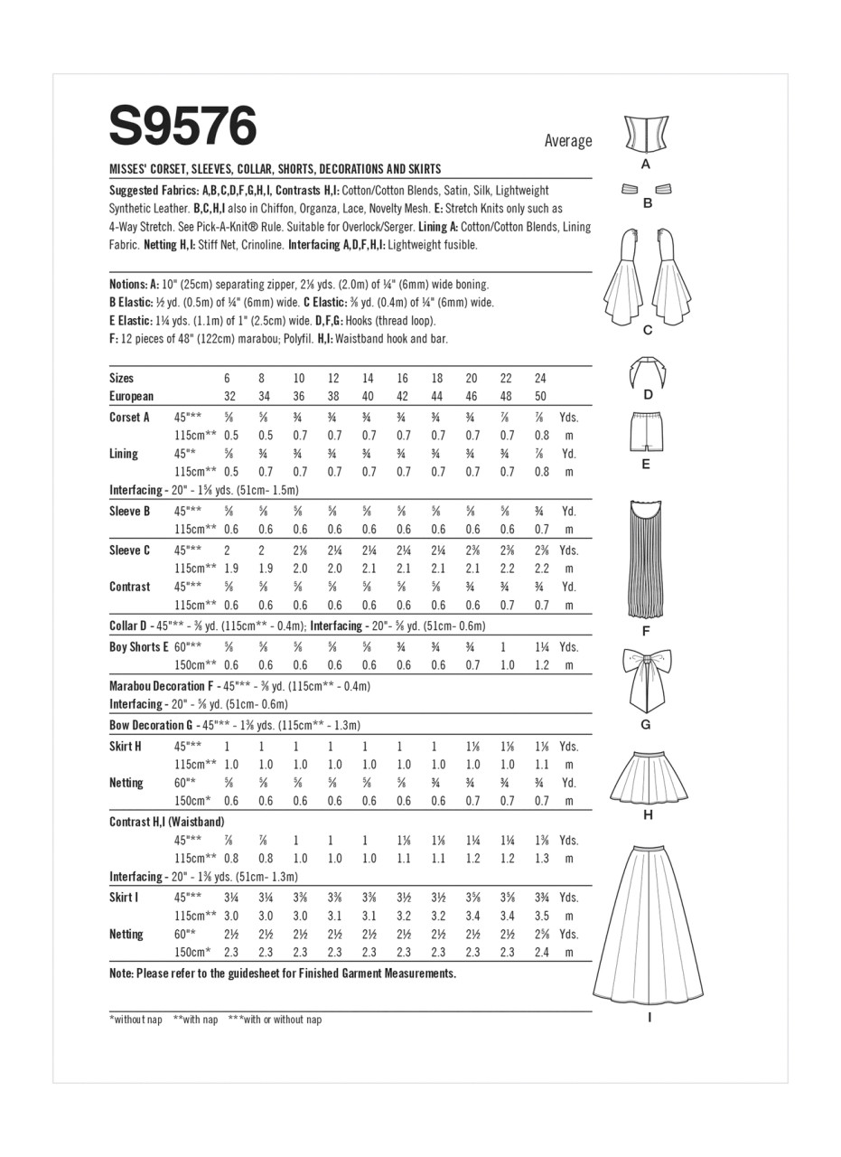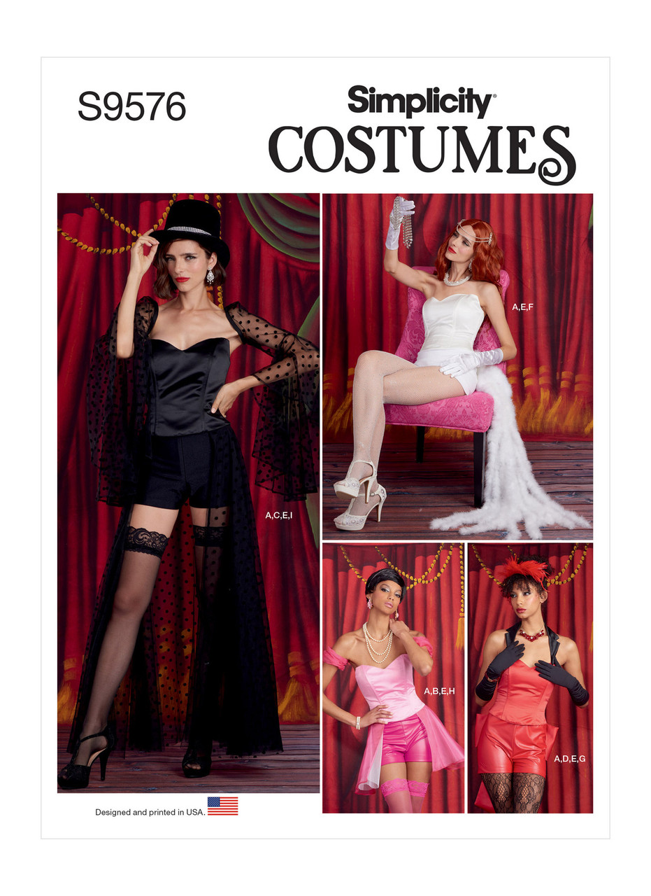 Boned corset has separating back zipper. Create different looks by adding a collar and sleeves. Hook decorations to thread loops on the back of the corset. Boy shorts have elastic waistband. Skirt is in two lengths.