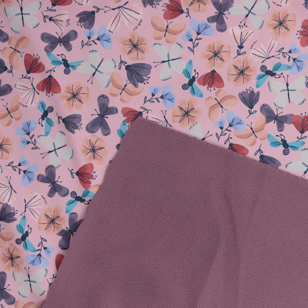 Sweet meets street in this mauve showerproof polyester, printed with an all-over butterfly motif. Backed with ultra-soft fleece, it's cosy on the inside and weather-ready on the outside. Perfect for bomber jackets, casual outerwear, and transitional layering pieces. Heavyweight with no stretch. Lining optional depending on your design.