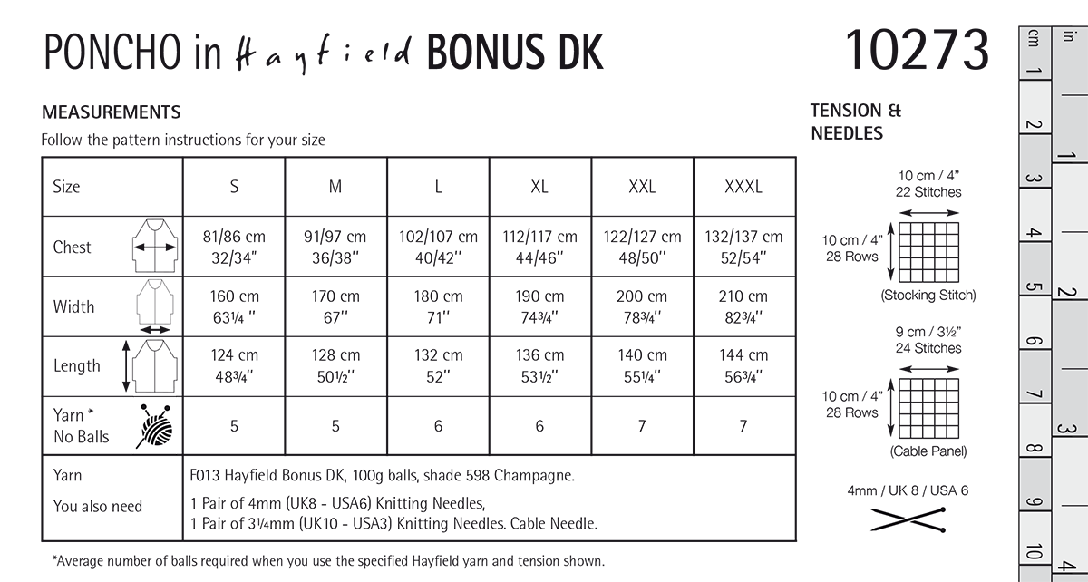 1 Pair of 4mm (UK8 – USA6) Knitting Needles, 1 Pair of 3.25mm (UK10 – USA3) Knitting Needles. Cable Needle.