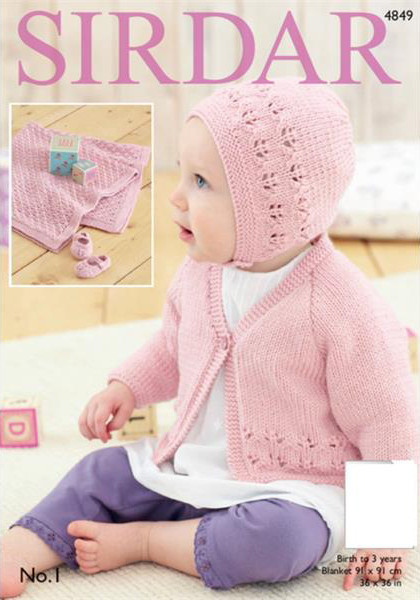 Matching baby cardigan, bonnet, shoes and blanket designed for babies from birth to 3 years in machine washable Sirdar No 1 DK.