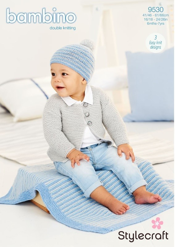 This design includes the pattern for a garter stitch jacket, bobble hat and matching blanket. We love the subtle stripes on the blanket and hat.