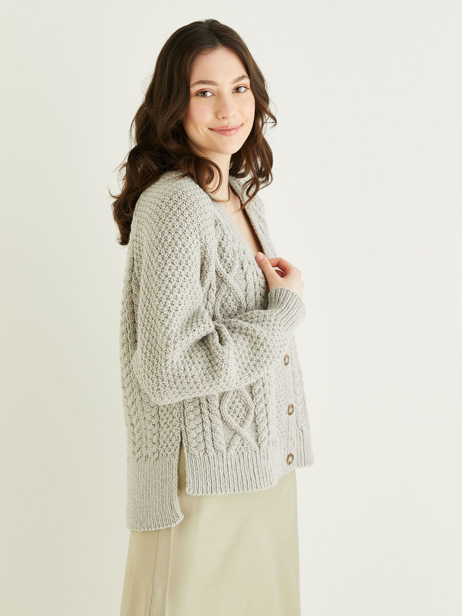 For our Feminine Aran collection, our designers have taken traditional Aran stitches and combined them with soft pastel shades and modern features like the split seams and stepped hem for extra warmth all winter in this classic raglan sleeved cardi.