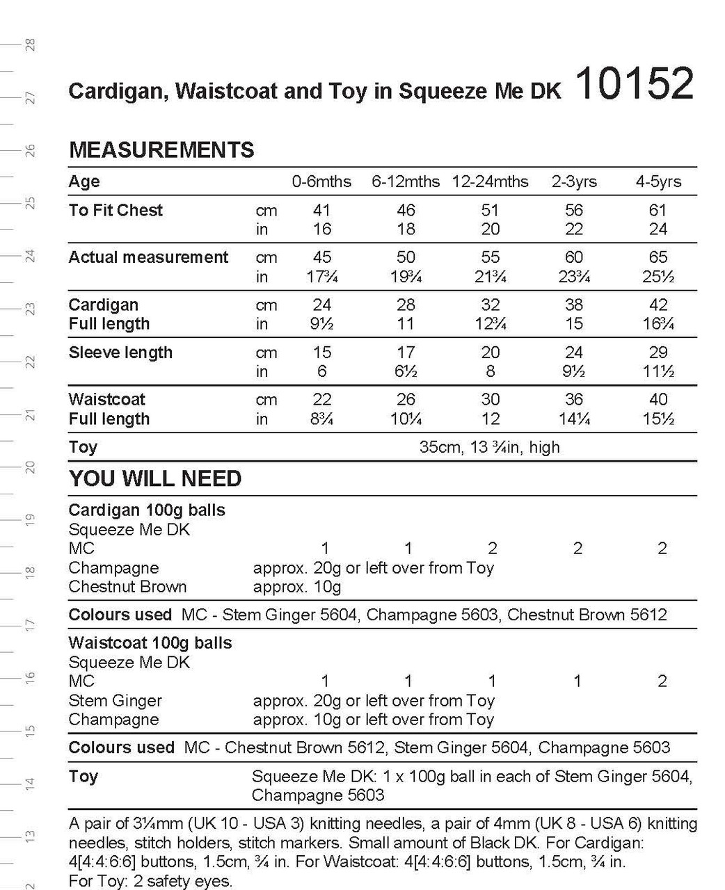 For Cardigan: 4[4:4:6:6] buttons, 1.5cm, ¾ in.