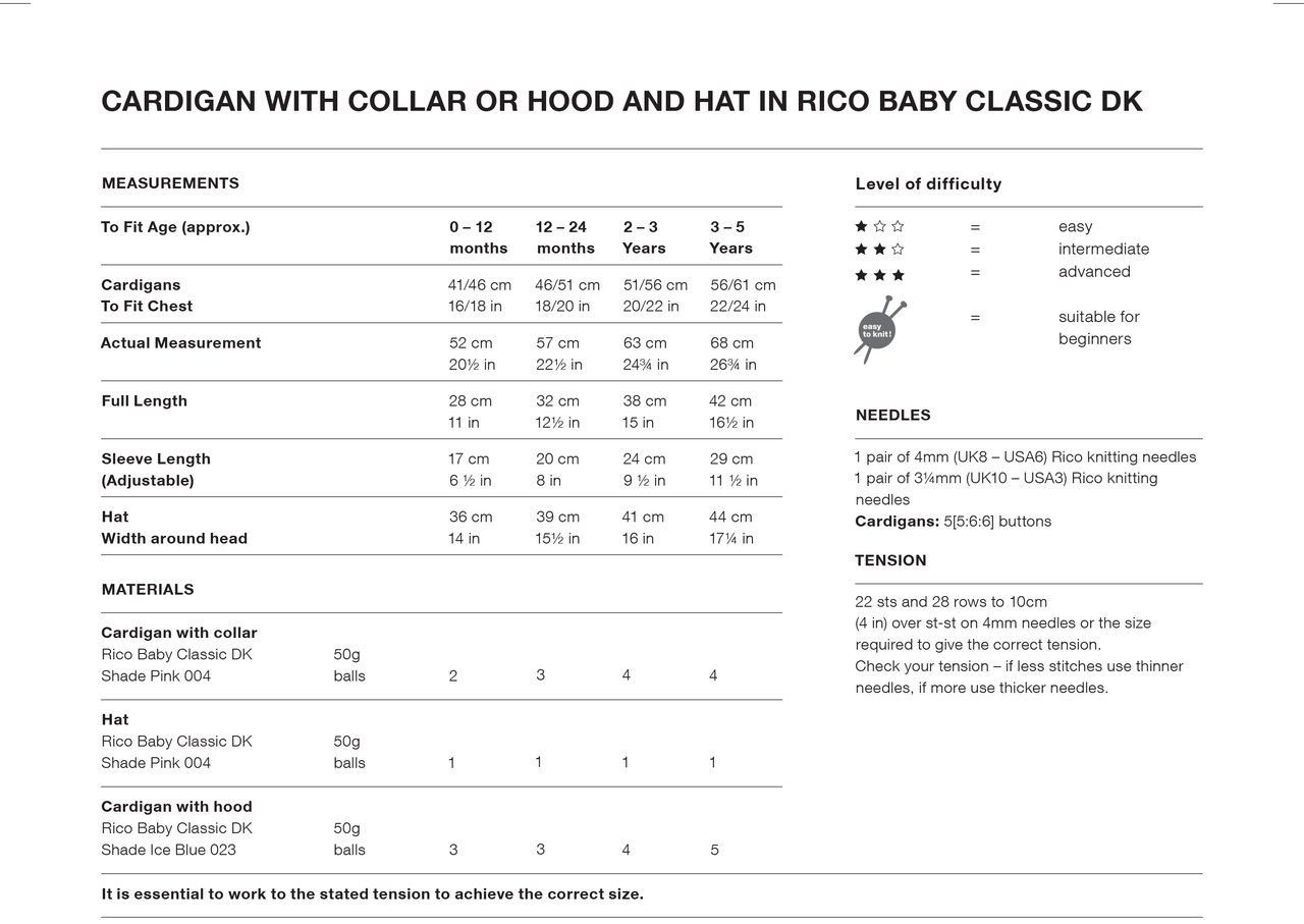 Cardigan with Collar or Hood & Hat in Rico Baby Classic DK (092) - PDF