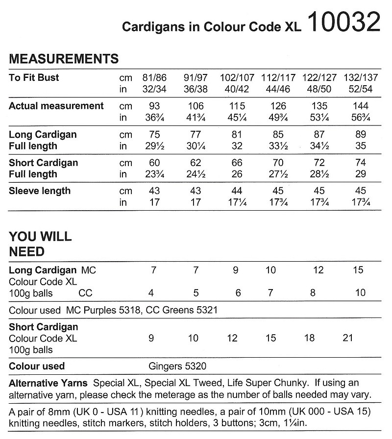 You will need: A pair of 8mm (UK 0 - USA 11) knitting needles, a pair of 10mm (UK 000 - USA 15) knitting needles, stitch markers, stitch holders, 3 buttons; 3cm, 1¼in.