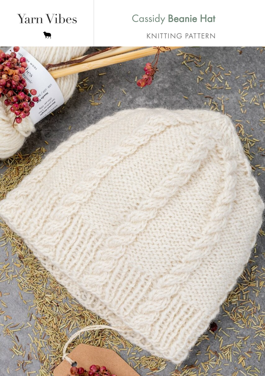 A unisex beanie hat knitting pattern, using 100% Irish yarn, the Cassidy hat features cables running from the brim to the crown. The pictured design uses Yarn Vibes Aran weight yarn. This pattern was inspired by the lakes of County Kerry.