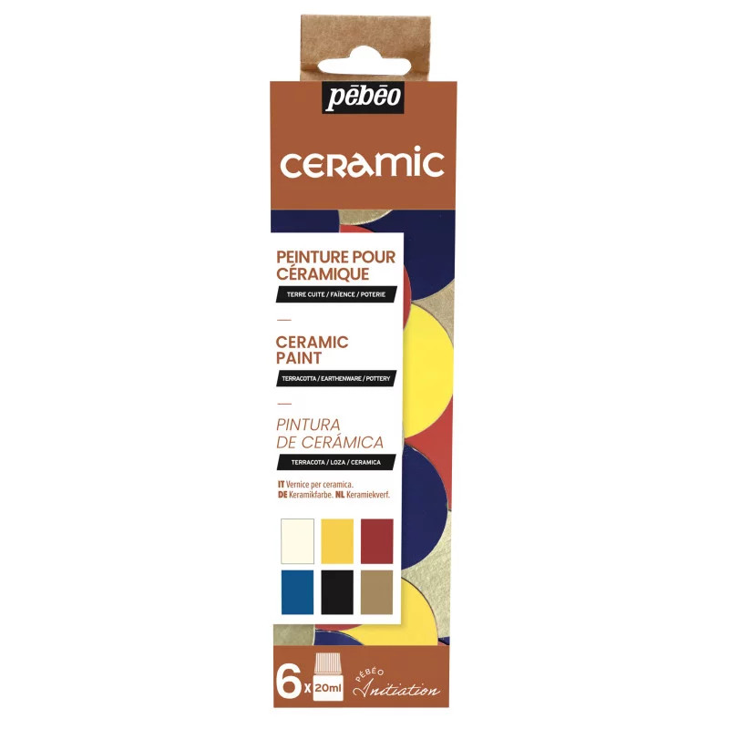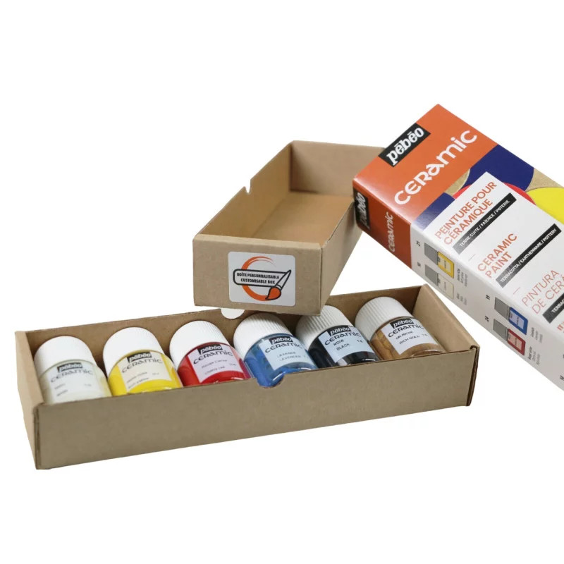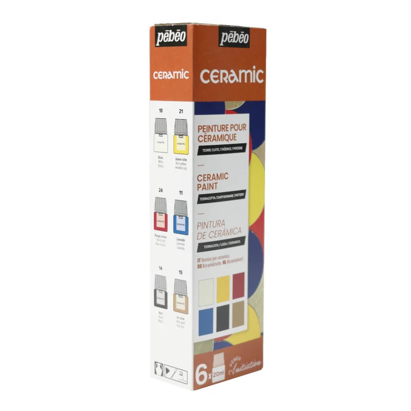 Pébéo Céramic ceramic paint sets are an economical and interesting way to start decorating terracotta, earthenware and ceramic objects. This solvent-based paint offers a lacquered effect that is perfectly resistant to light, with vibrant colours. For a perfect finish on porous surfaces, we recommend applying a pore-filling undercoat before painting. A little professional advice: to avoid drips when applying to rounded surfaces, we recommend not overloading your brush. Pebeo's Ceramic colours can be applied with a brush, sponge, stencil or vat technique. You can also use them thickly and combine them with other materials such as sand or engravings with a stick to obtain even more original effects. Ceramic colours can also be used in combination with colours from Pebeo's Fantasy Moon range to create marbling effects. Drying time is very fast, in just 2 hours you can touch your creations, and in 10 hours they are completely dry. Ceramic colours can be diluted with odourless mineral spirits or White Spirit. Pébéo Ceramic paints are used by professionals and hobbyists alike. If you're looking for a quality paint for your terracotta, ceramic and earthenware decoration projects, you've come to the right place!