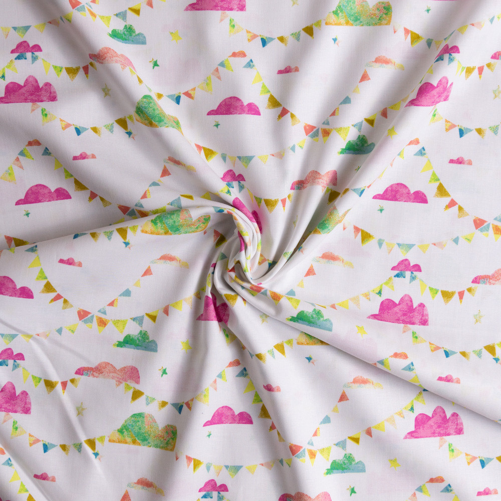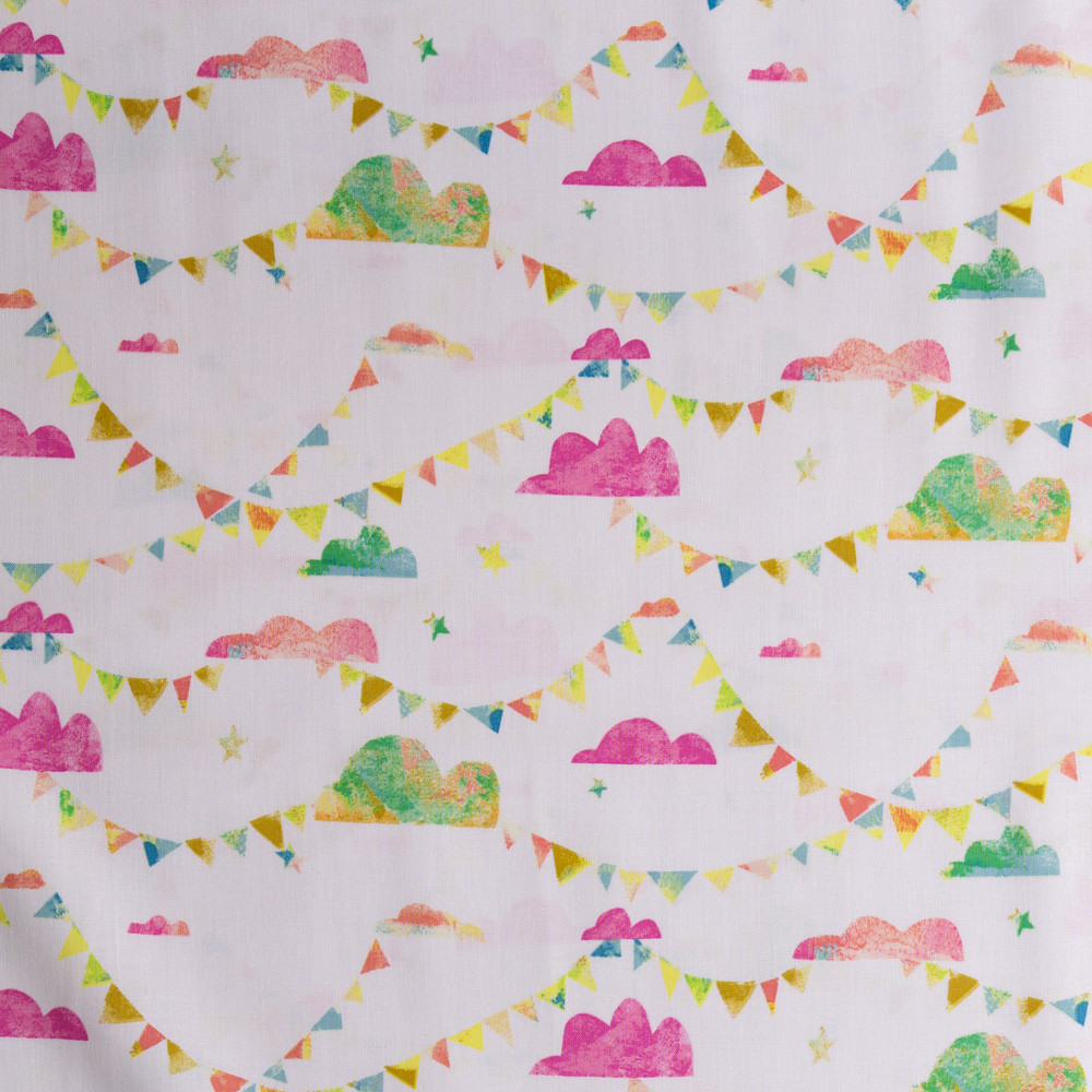 Pink and green watercolour clouds and bunting on an off-white background. Beautiful, high quality, printed cotton fabric. Ideal for quilting, masks, crafts, displays, table decoration and as a dressmaking fabric.