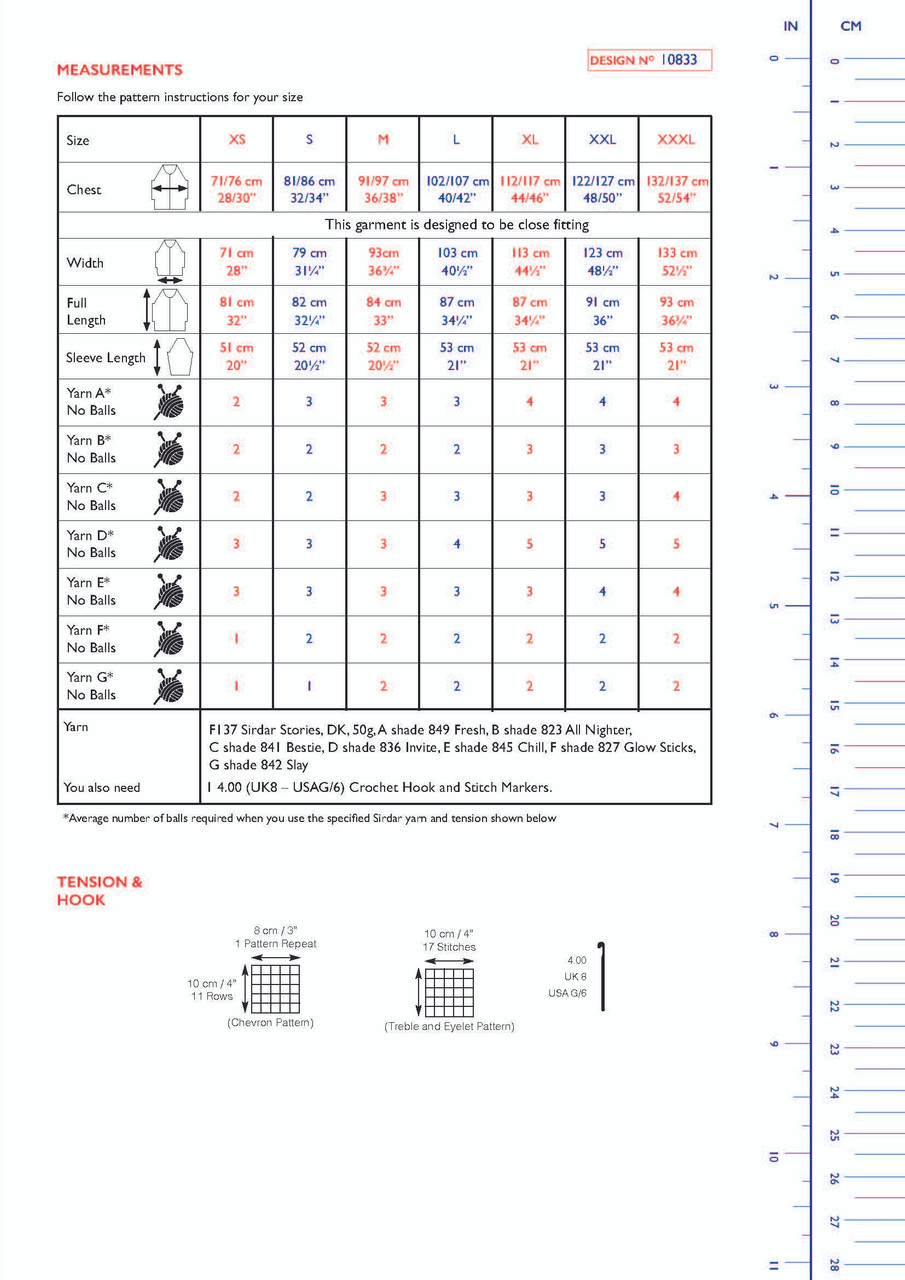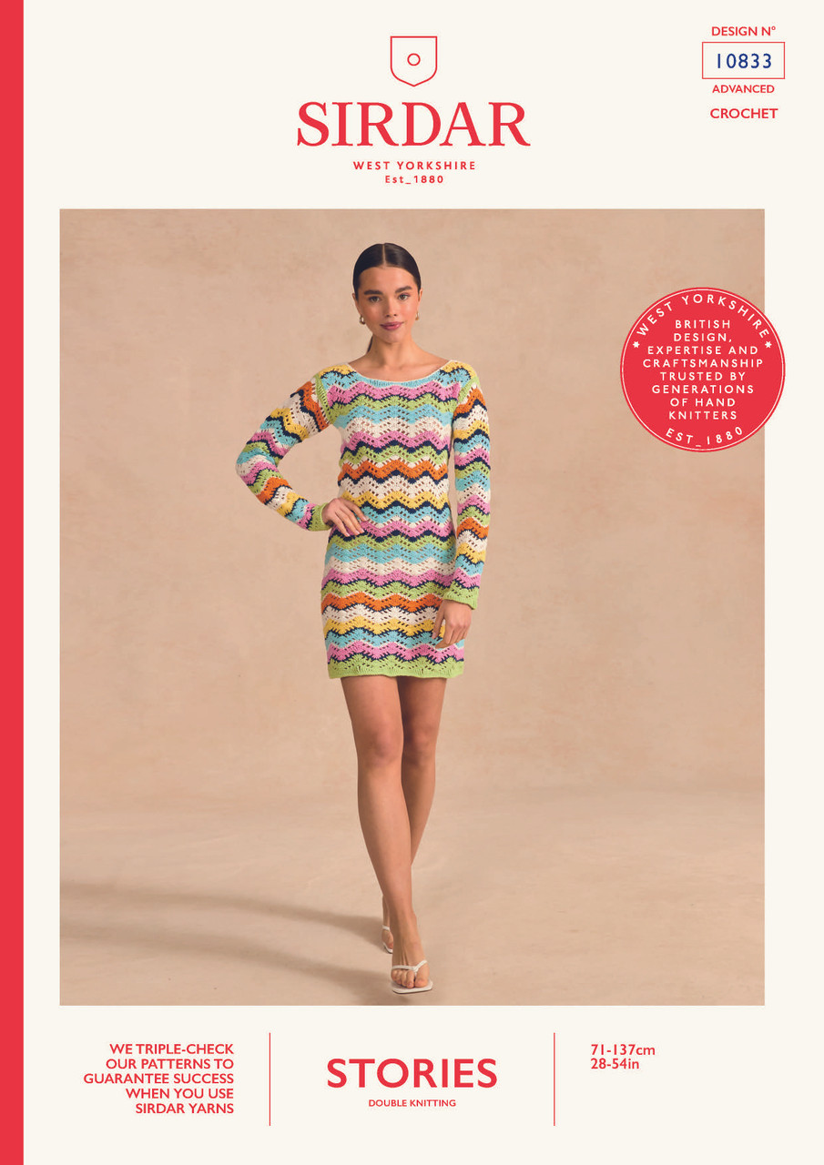 Use the eyelet chevron stitch to create the waves on the Cheeky Chevron Mini Dress. Pictured here with 7 shades, this colorful piece has long sleeves and a round neckline.