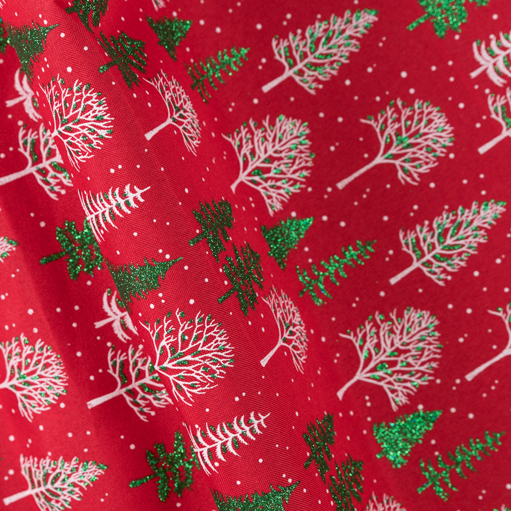 Glitter Christmas trees scatter this red background. Christmas is of course a special time of the year for families and friends to come together in celebration. Let us help you add a touch of elegance to your Christmas decorations with our collection of high quality, 100% polyester Christmas Fabrics. Perfect for simple projects such as tablecloths, aprons, Christmas stockings and even toys and crafts.