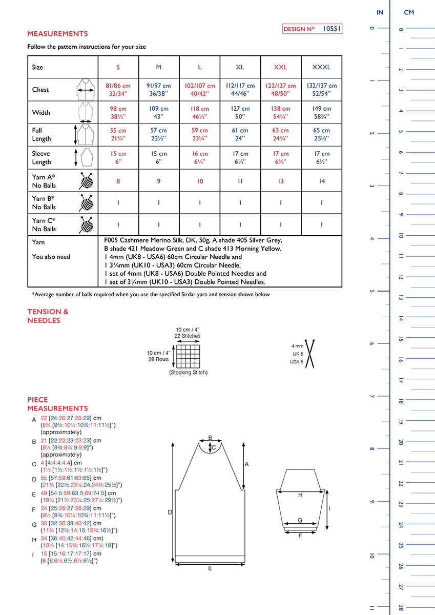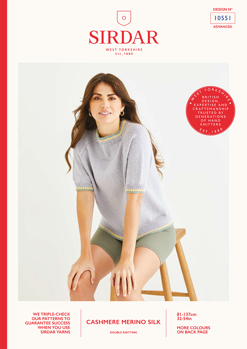 This knitting pattern features a round neck and short raglan sleeves. Knit this smart tee in three different shades of Cashmere Merino Silk, and we suggest picking a fresh contrast colour to finish the ribs.