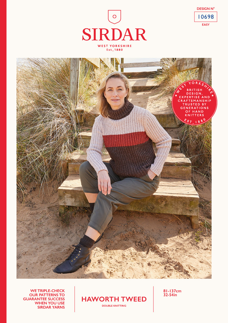 The Coastline Roll Neck knitting pattern features bold colour-blocking in cosy rib and classic set-in sleeves. Hand knit this sweater in the autumnal shades featured in our knitting pattern or choose your own combination of Sirdar Haworth Tweed colours to suit your wardrobe.