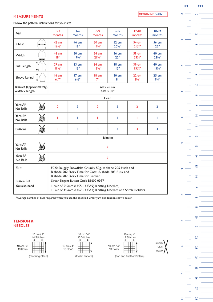 1 pair of 5½mm (UK5 – USA9) Knitting Needles, 1 Pair of 4½mm (UK7 – USA7) Knitting Needles and Stitch Holders. 3 buttons.