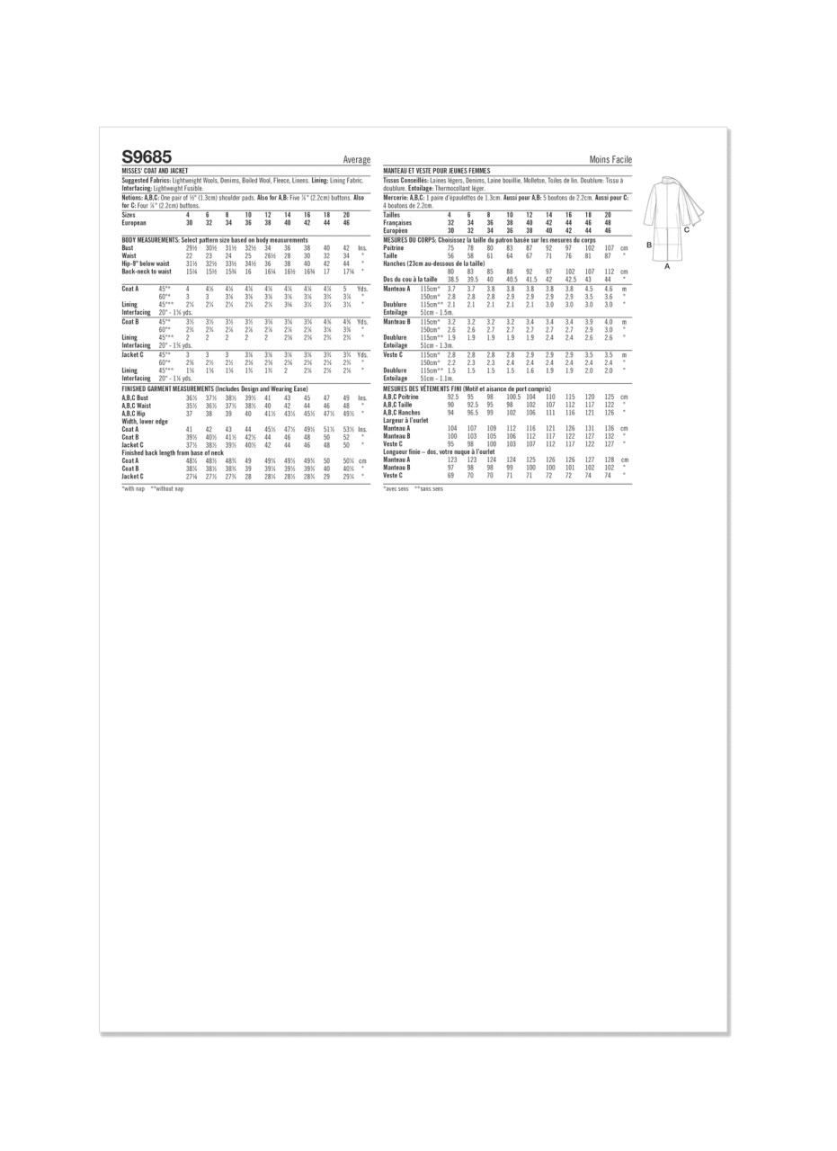 Lined coat and jacket features attached scarf and has button front closure and pockets. Coat comes in two lengths. View C is a short jacket.