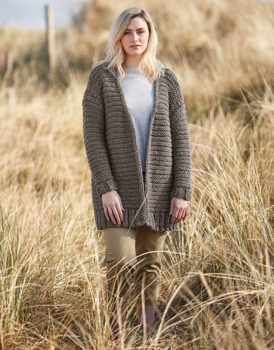 Wrap up warm in our longline textured coatigan. Knitted in our Hayfield Bonus Super Chunky yarn, it is perfect for those autumn evenings when you can’t decide between a cardigan or a coat. with instructions for sizes from a full range of sizes.