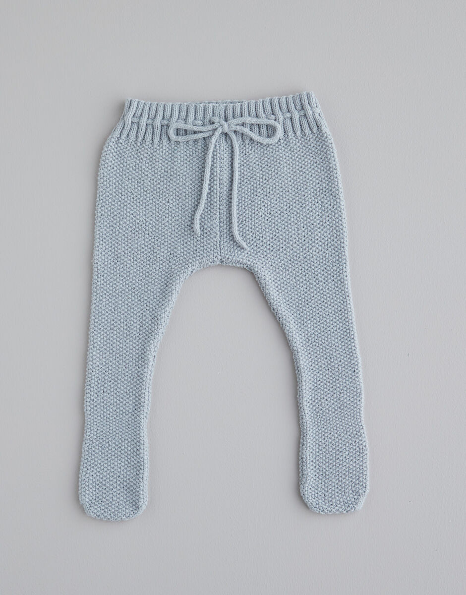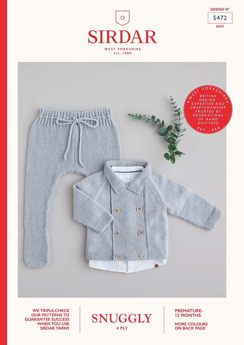 A smart knitted two piece for the cutest of new-borns. Moss stitch this double-breasted baby jacket with raglan sleeves. You’ll then moss stitch the little trousers as well and finish with rib and an icord fastening at the waistband.