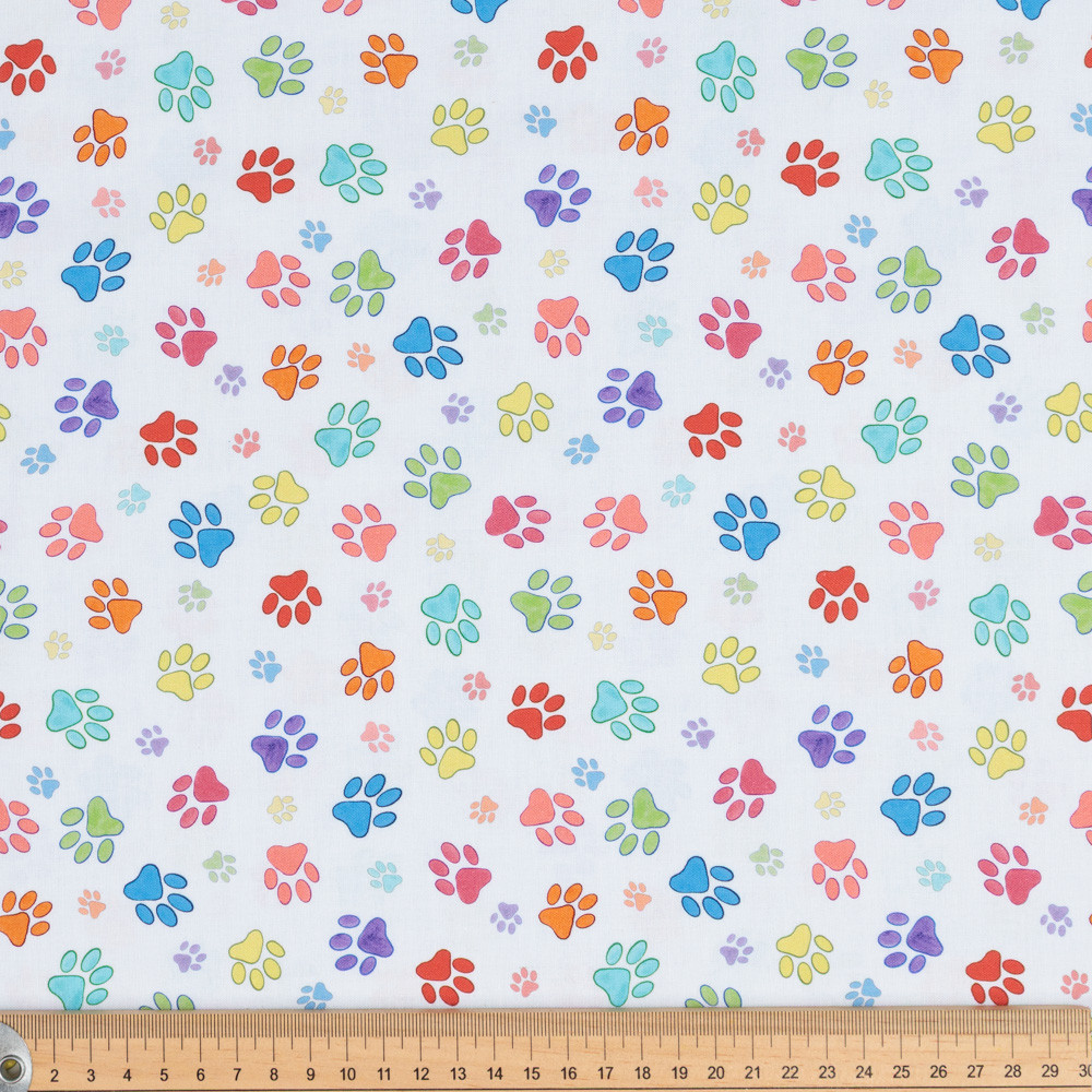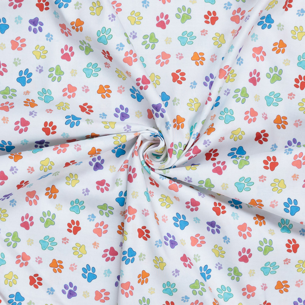 Multicoloured paws on white. Beautiful, high quality, printed cotton fabric. Ideal for quilting, masks, crafts, displays, table decoration and as a dressmaking fabric.