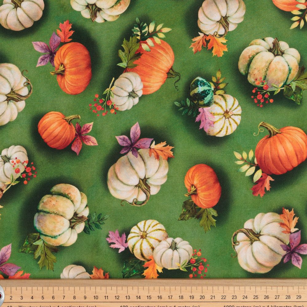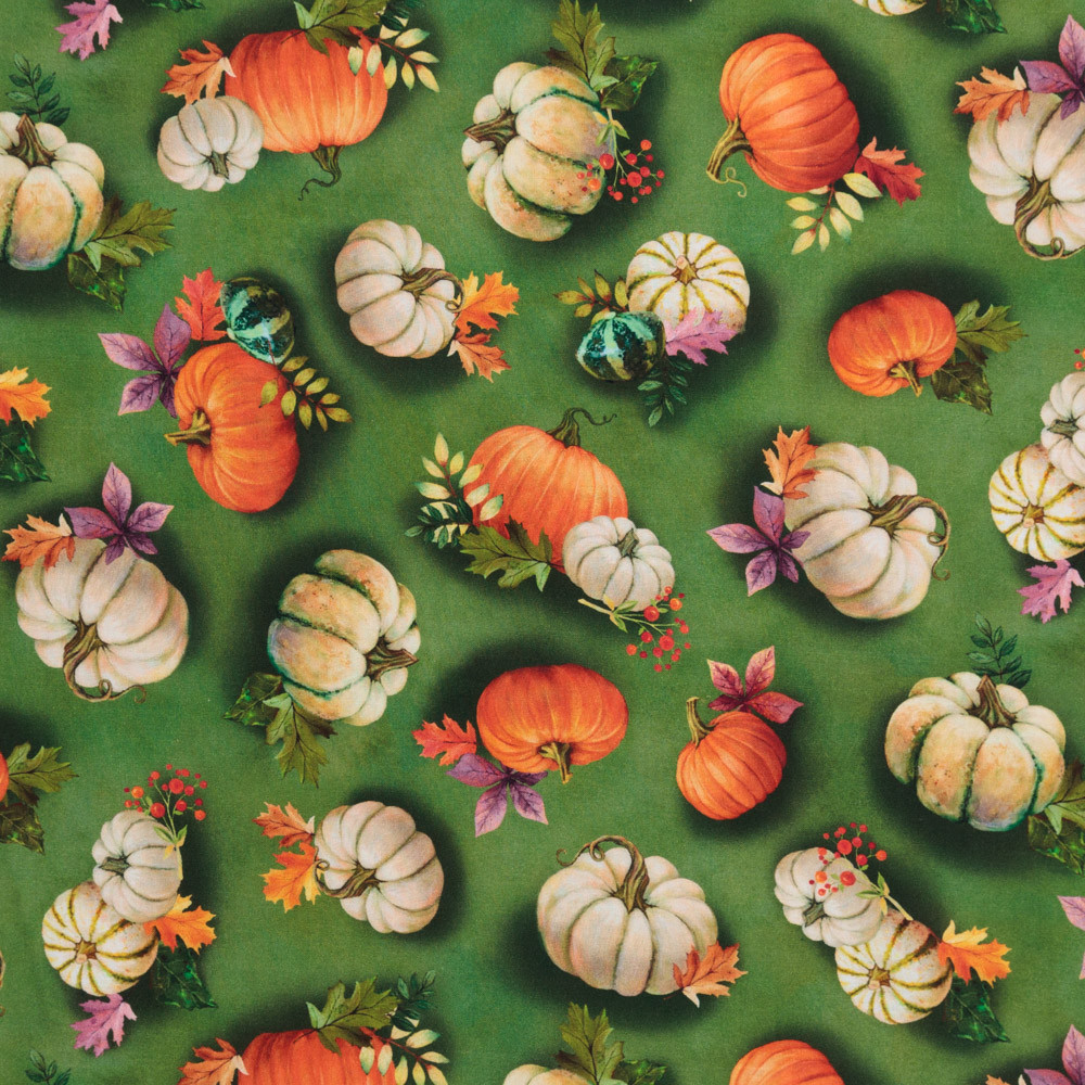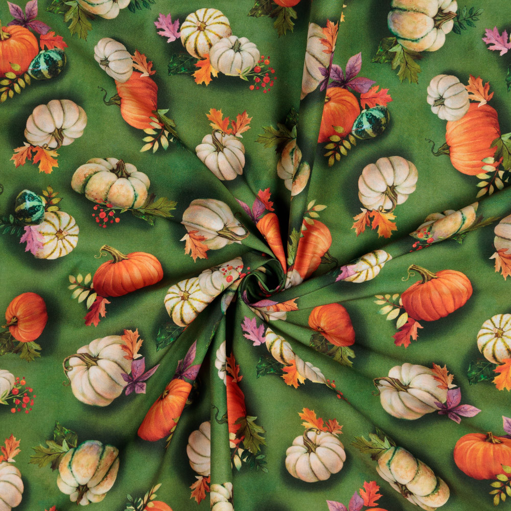 Painterly Autumnal pumpkins on green. Beautiful, high quality, printed fabric. Ideal for quilting, masks, crafts, displays, table decoration and as a dressmaking fabric.