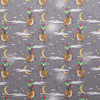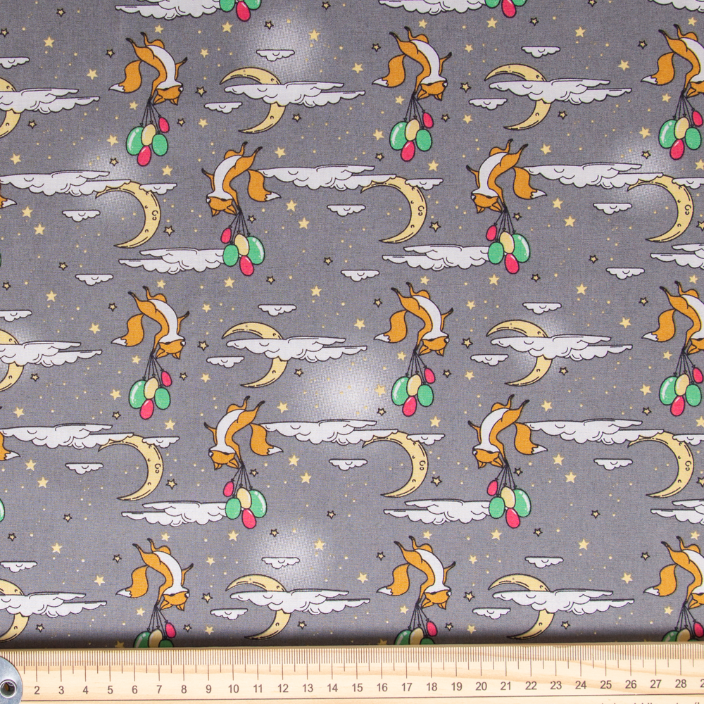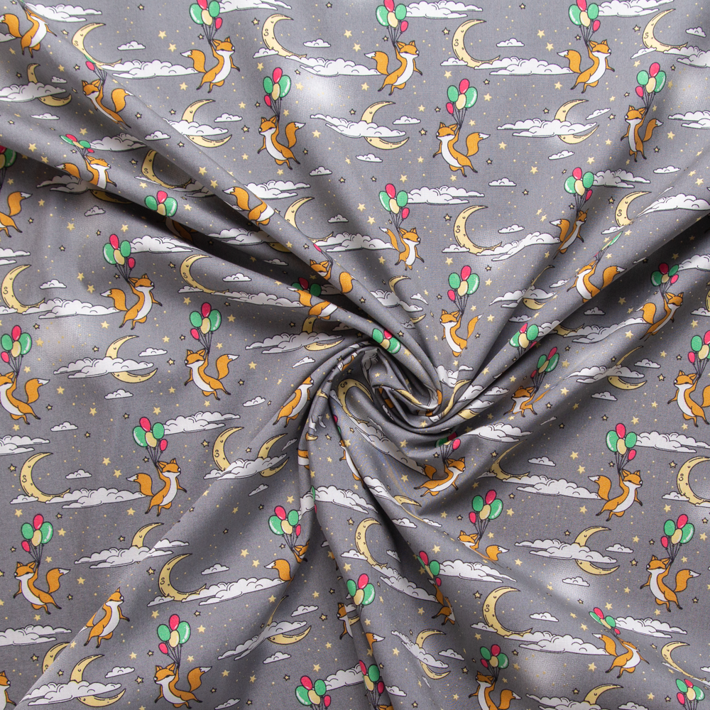 This 100% cotton fabric features light orange foxes holding green, yellow and red balloons and flying to the moon in a star filled and cloudy sky at dusk. Being set against a grey backing, the colours of this material are subtle. This creates a lovely, whimsical scene that will be appreciated by adults and children alike. This fabric is ideal for craft and clothing applications.