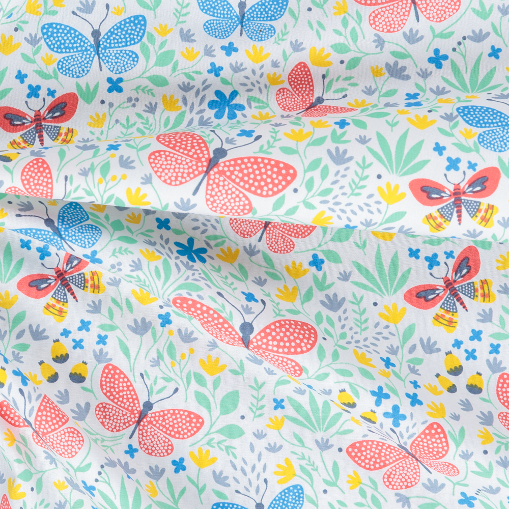 Blue and orange/red butterlies set against a floral white background. This cotton poplin is ideal to use in your sewing projects, such as quilting, patchwork, dressmaking, blankets, etc. It's a lightweight fabric that hangs well and has a soft feel.