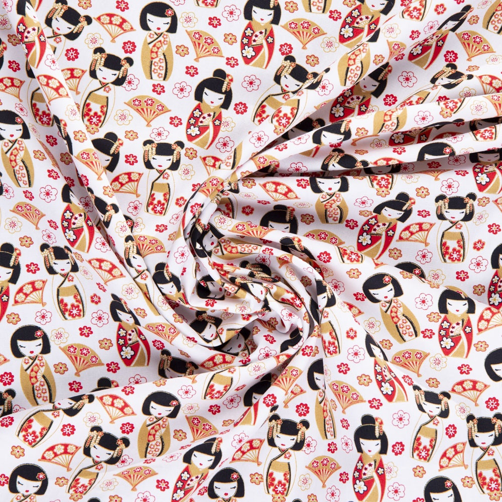 Cotton Poplin Print - Japanese Dolls on White - Per ½ Metre