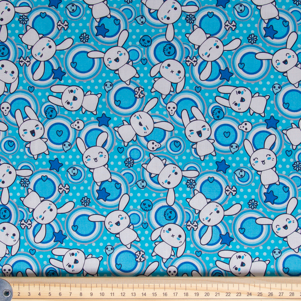 Kawaii bunny characters create the bulk of this scatter pattern on blue, complemented by stars, skulls, rainbow circles and other cute motifs. This cotton poplin is ideal to use in your sewing projects, such as quilting, patchwork, dressmaking, blankets, etc. It's a lightweight fabric that hangs well and has a soft feel.