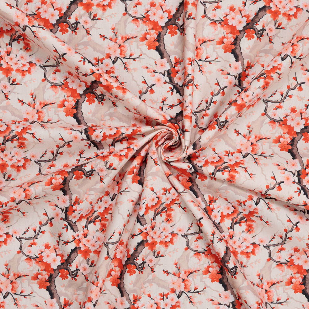 Cherry blossom trees on a natural background. This cotton poplin is ideal to use in your sewing projects, such as quilting, patchwork, dressmaking, blankets, etc. It's a lightweight fabric that hangs well and has a soft feel.