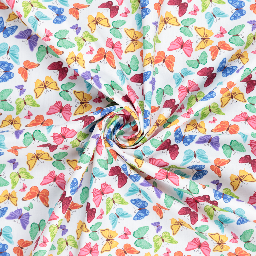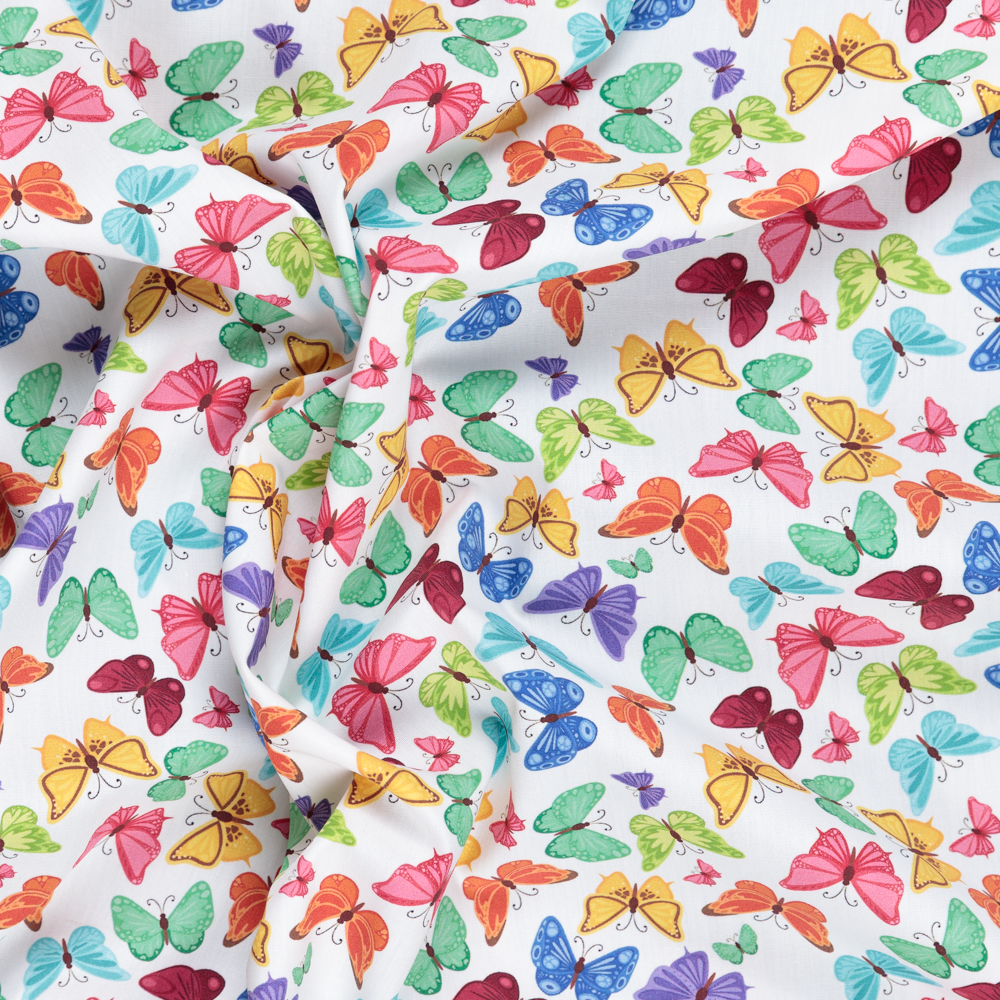Brightly coloured butterflies create this allover pattern on white. This cotton poplin is ideal to use in your sewing projects, such as quilting, patchwork, dressmaking, blankets, etc. It's a lightweight fabric that hangs well and has a soft feel.