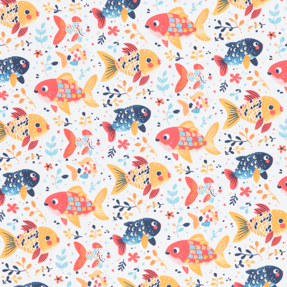 Brightly coloured fish and sea plants create this allover pattern on white. This cotton poplin is ideal to use in your sewing projects, such as quilting, patchwork, dressmaking, blankets, etc. It's a lightweight fabric that hangs well and has a soft feel.