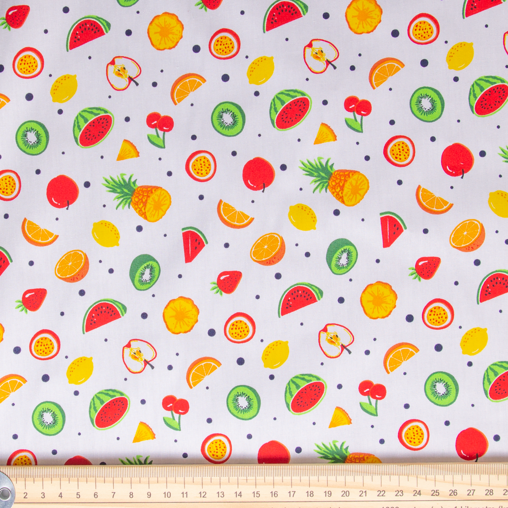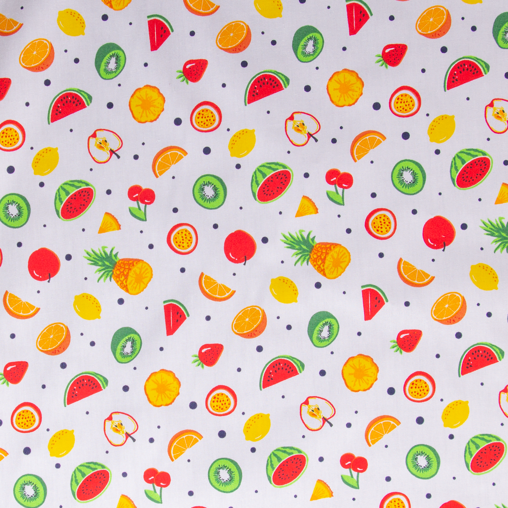 Summery fruits create this allover pattern on white. This cotton poplin is ideal to use in your sewing projects, such as quilting, patchwork, dressmaking, blankets, etc. It's a lightweight fabric that hangs well and has a soft feel.