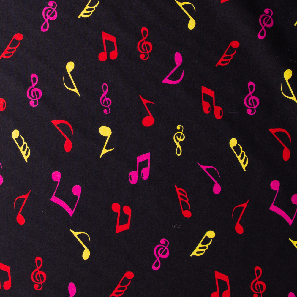 Pink, red and yellow music notes create this allover pattern on black. This cotton poplin is ideal to use in your sewing projects, such as quilting, patchwork, dressmaking, blankets, etc. It's a lightweight fabric that hangs well and has a soft feel.