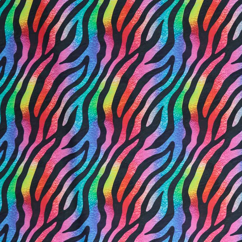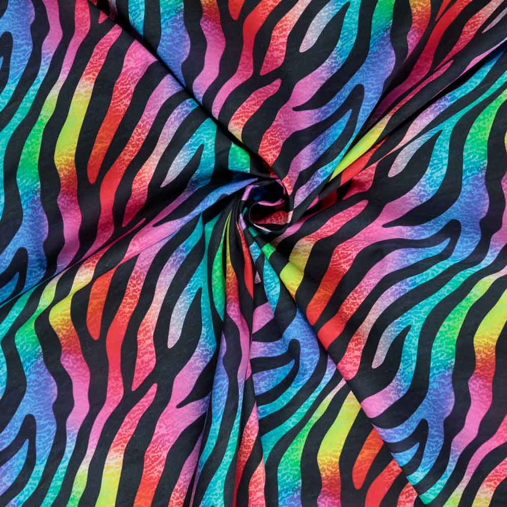 Zebra print on a ombre neon background joins our ever increasing menagerie of designs. This fabric is ideal for craft and clothing applications.