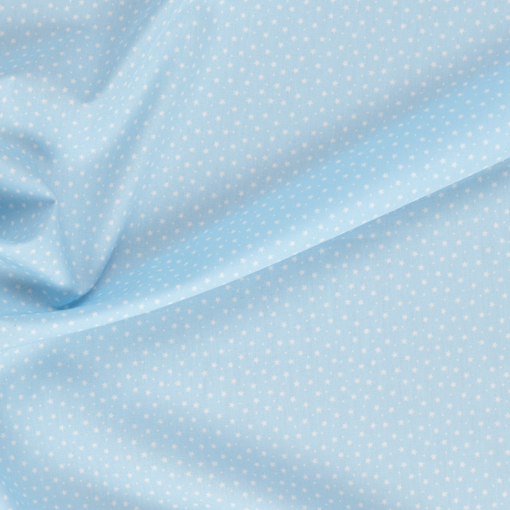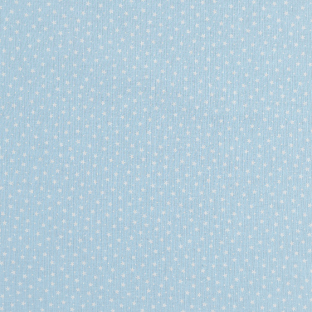 White stars on a light blue background. This cotton poplin is ideal to use in your sewing projects, such as quilting, patchwork, dressmaking, blankets, etc. It's a lightweight fabric that hangs well and has a soft feel.