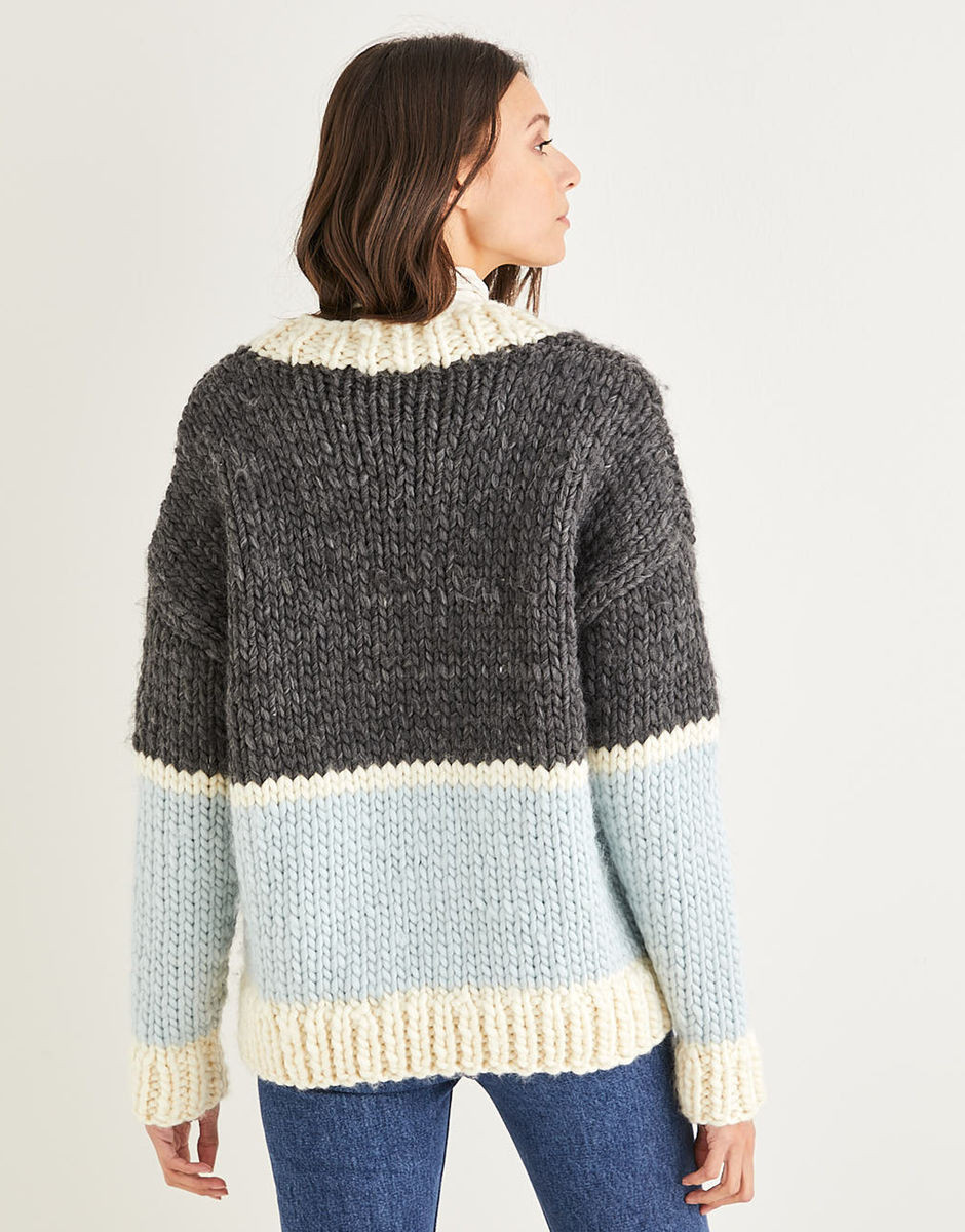 Why not get adventurous and learn a new technique. This super chunky colour-block sweater in Sirdar Adventure features a contrast floating stitch detail for added interest. The relaxed shape has dropped sleeves and a crew neck for extra cosy.