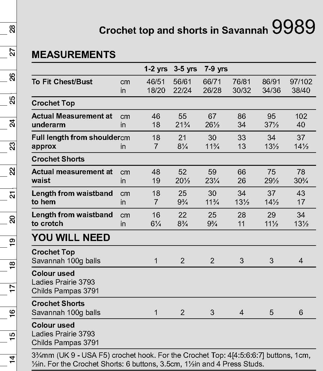 3¾mm (UK 9 - USA F5) crochet hook. For the Crochet Top: 4[4:5:6:6:7] buttons, 1cm, ½in. For the Crochet Shorts: 6 buttons, 3.5cm, 1½in and 4 Press Studs.