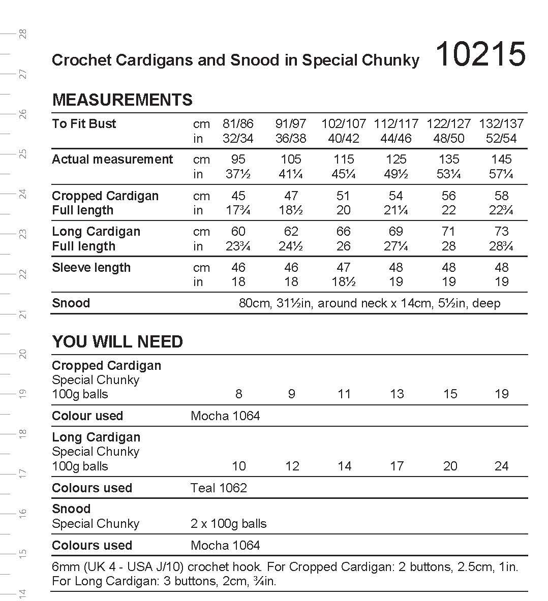 6mm (UK 4 - USA J/10) crochet hook. For Cropped Cardigan: 2 buttons, 2.5cm, 1in.