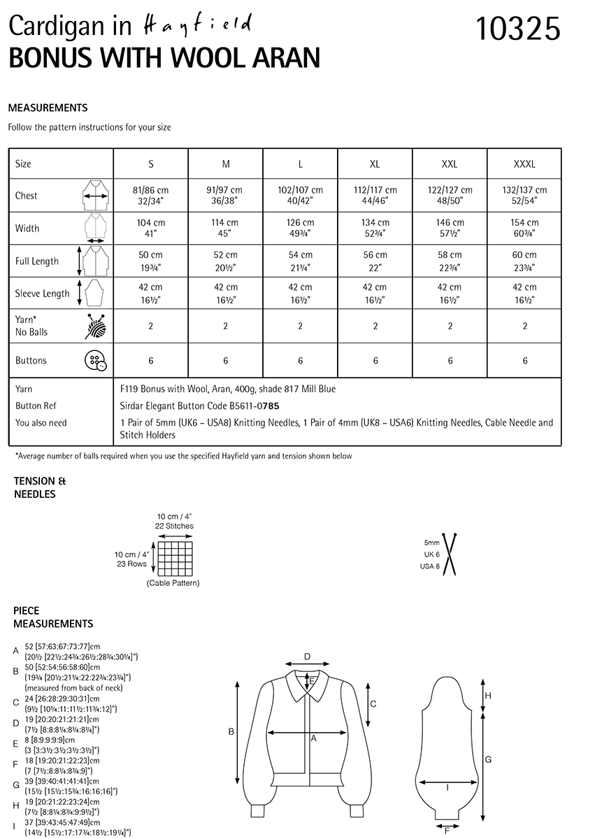 1 Pair of 5mm (UK6 – USA8) Knitting Needles, 1 Pair of 4mm (UK8 – USA6) Knitting Needles, Cable Needle and Stitch Holders. 6 buttons.