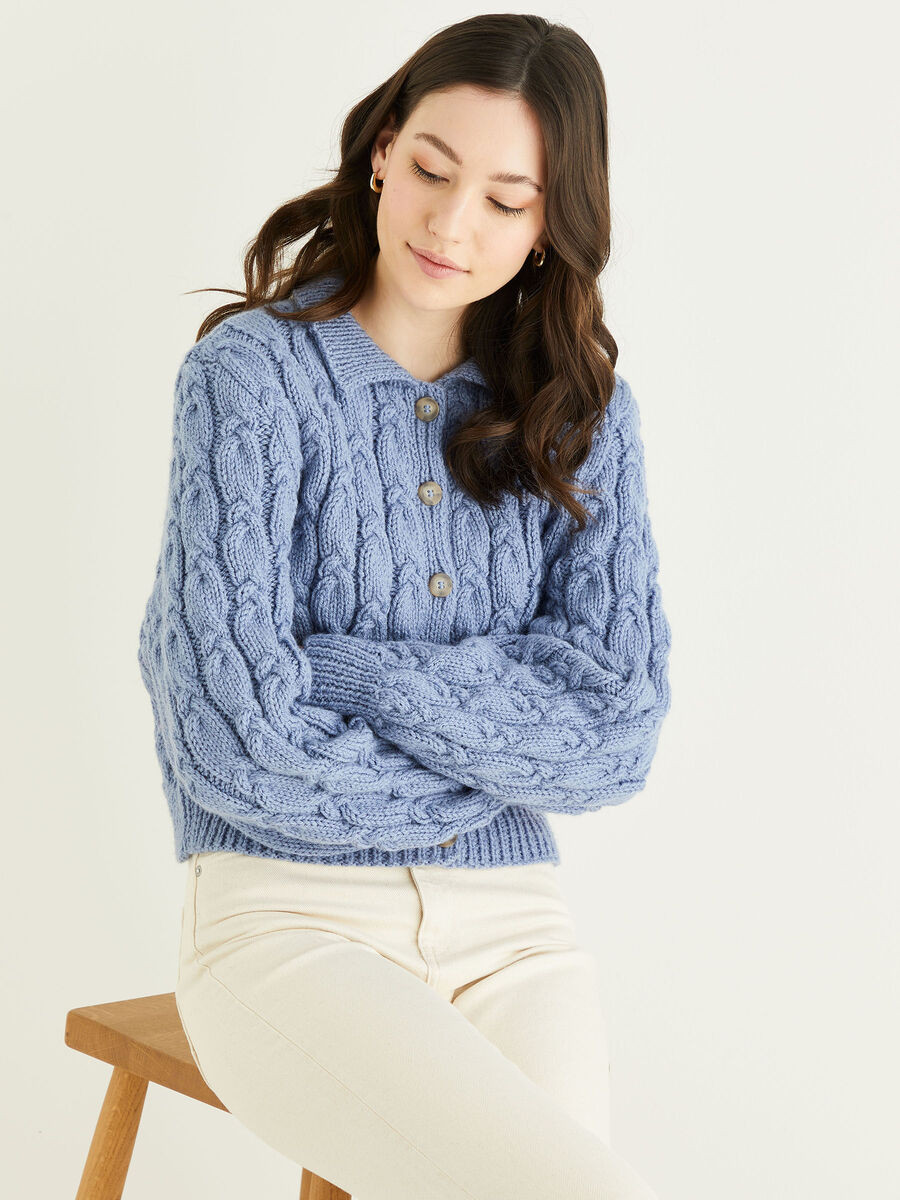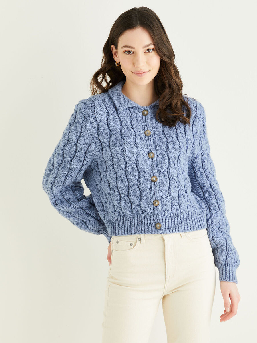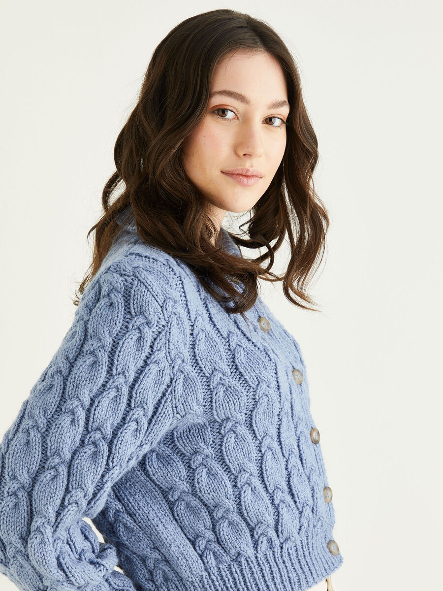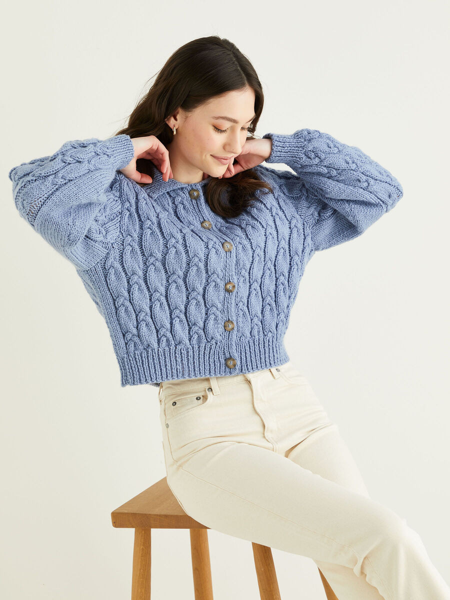 For a trend-led addition to your wardrobe, you couldn't do better than this balloon sleeved cropped cardi. With all-over cabling, the nipped in shape and cute collar add femininity to this Aran knit in a pretty pastel shade.