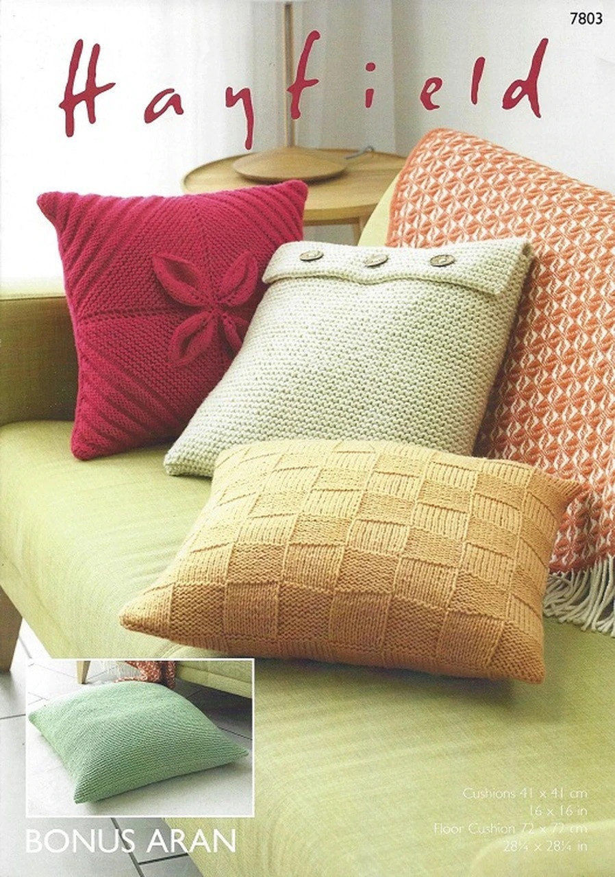 Selection of cushion covers to knit, pictured in Hayfield Bonus Aran 400g balls.