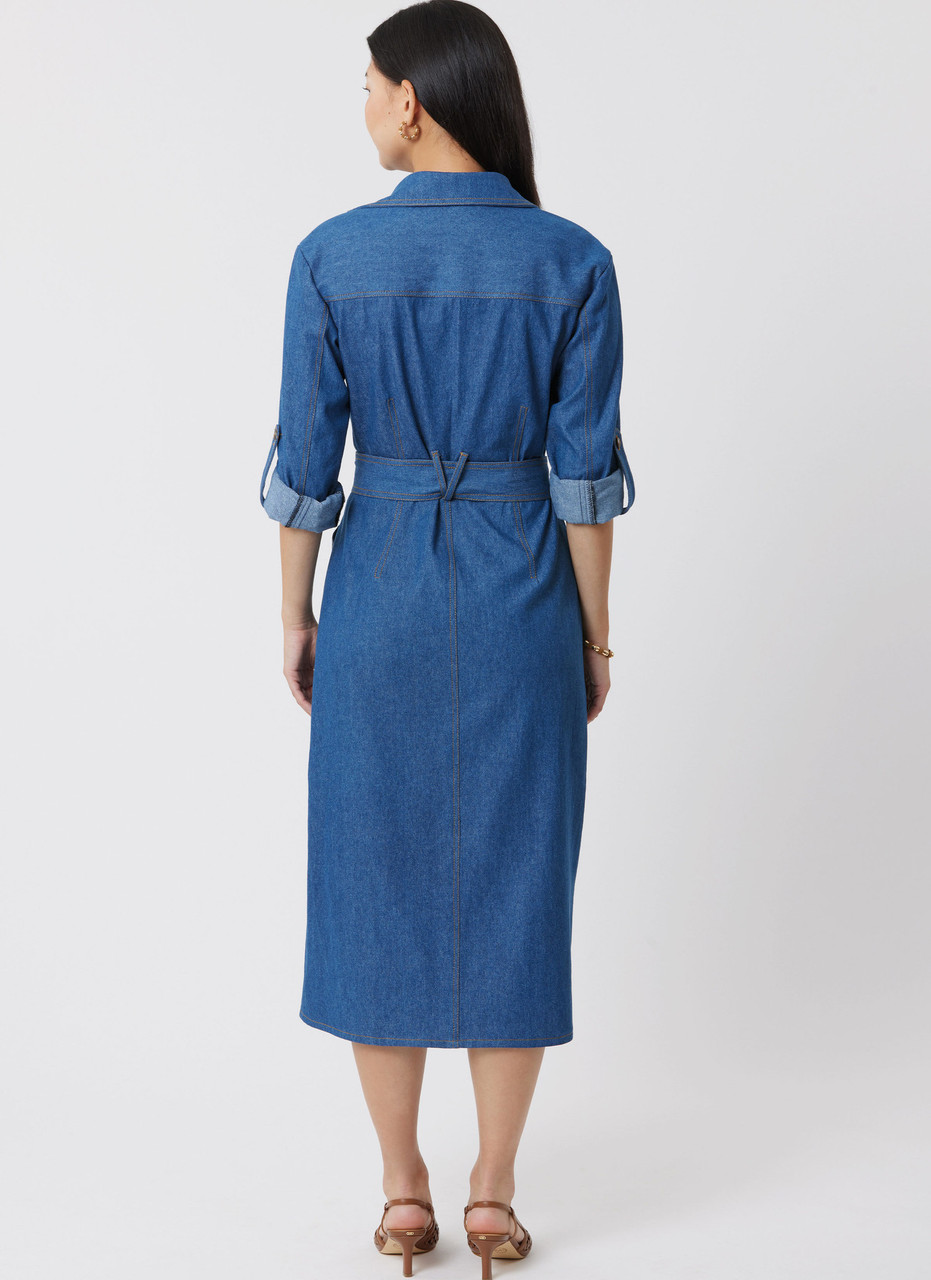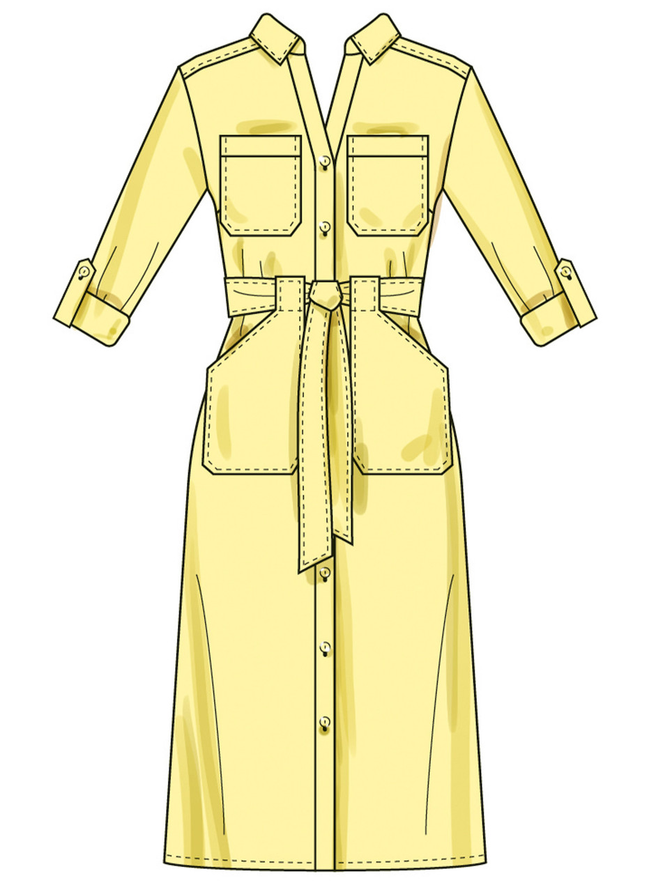 Dress patterns in three length variations have front button opening, collar, collar band, dropped shoulders, front patch pockets, back yoke, back darts and sleeve variations. View A has long sleeves with cuffs. View B has rolled sleeves with button tab. View C has short sleeve with a foldback cuff.