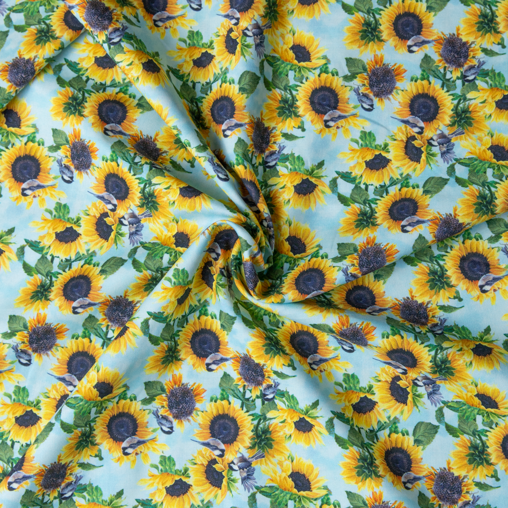 Sunflowers and small birds make up this pretty print on sky blue. Beautiful, high quality, printed cotton fabric. Ideal for quilting, masks, crafts, displays, table decoration and as a dressmaking fabric.