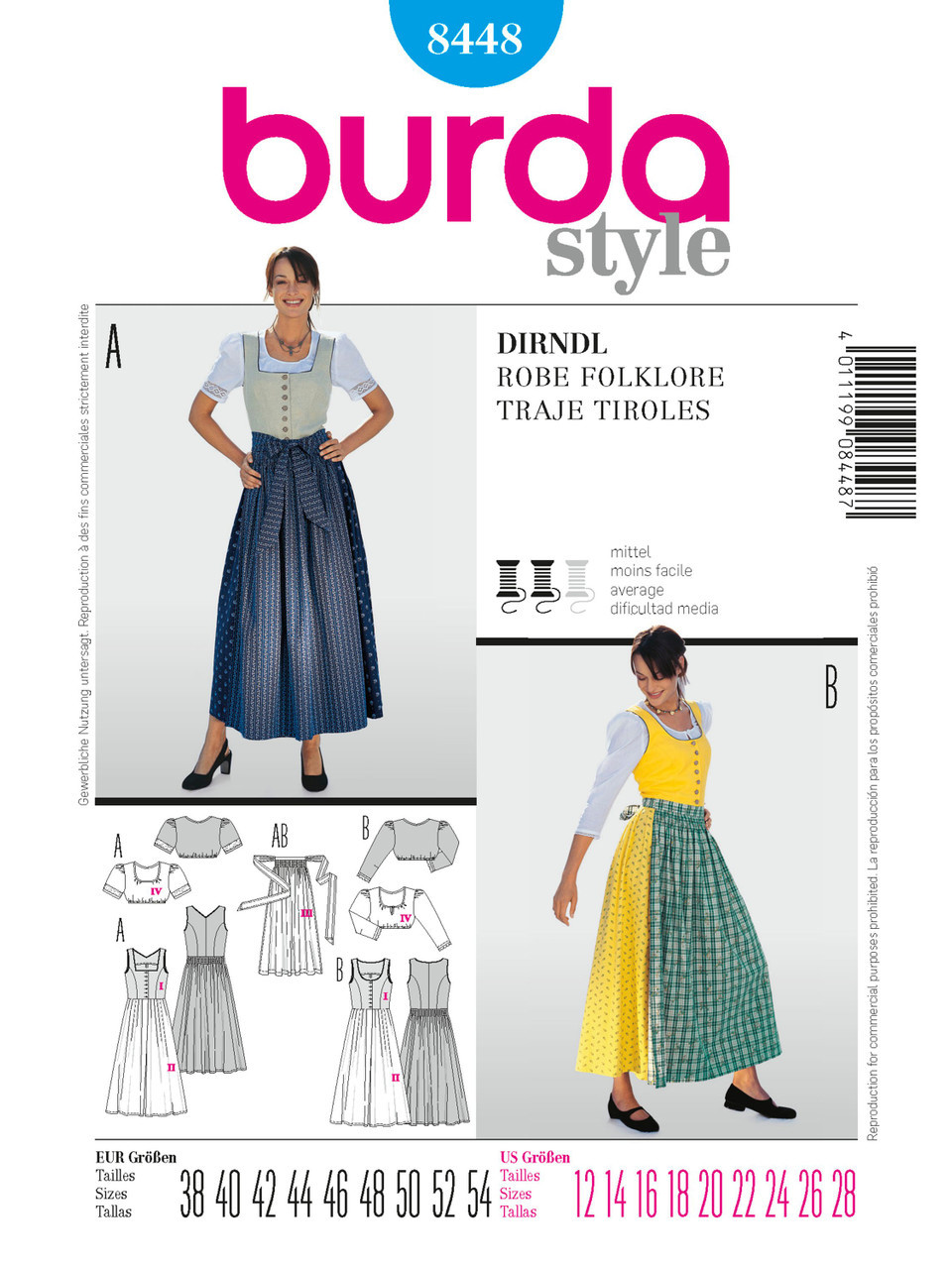 A: Dress with square neckline, blouse with short sleeves. B: Dress with round neckline, blouse with 3/4-length sleeves. AB: apron Skirt are pleated in the front and ruffled in the back