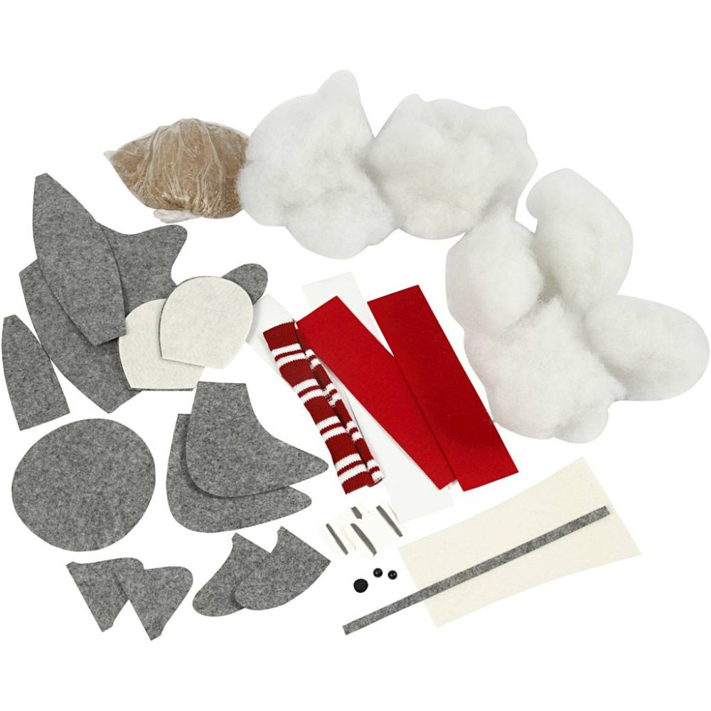 Contents: Pre-cut parts from grey, red and off-white felt, 2 black wooden beads, polyester stuffing, pieces of card for making the gift, knitted scarf and thread. Instructions included. The size indicates the dimensions of the finished product.