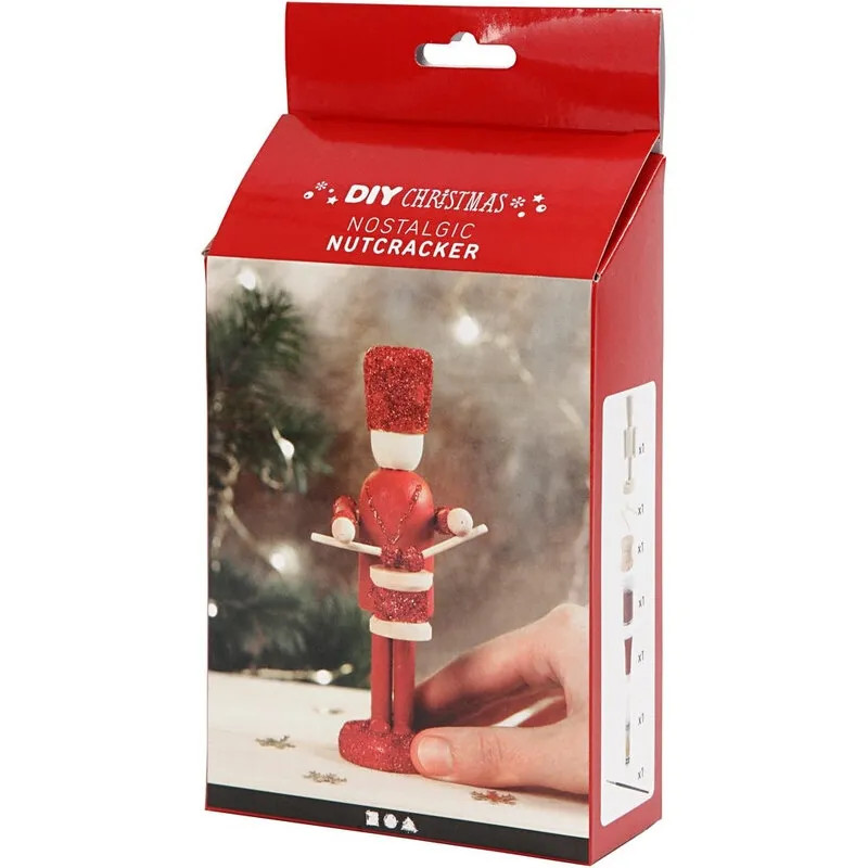 Material kit for 1 nutcracker consisting of figure and drum set of wood, paint, brush, glue and glitter.