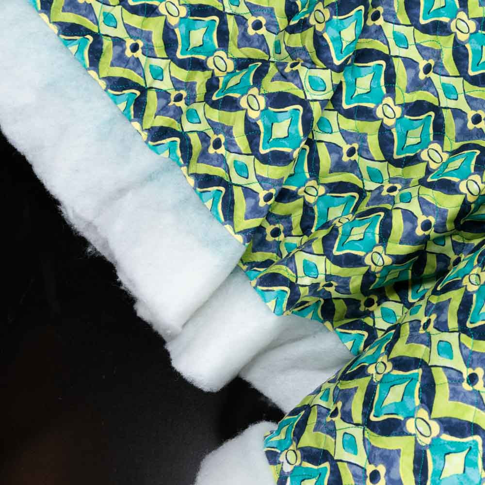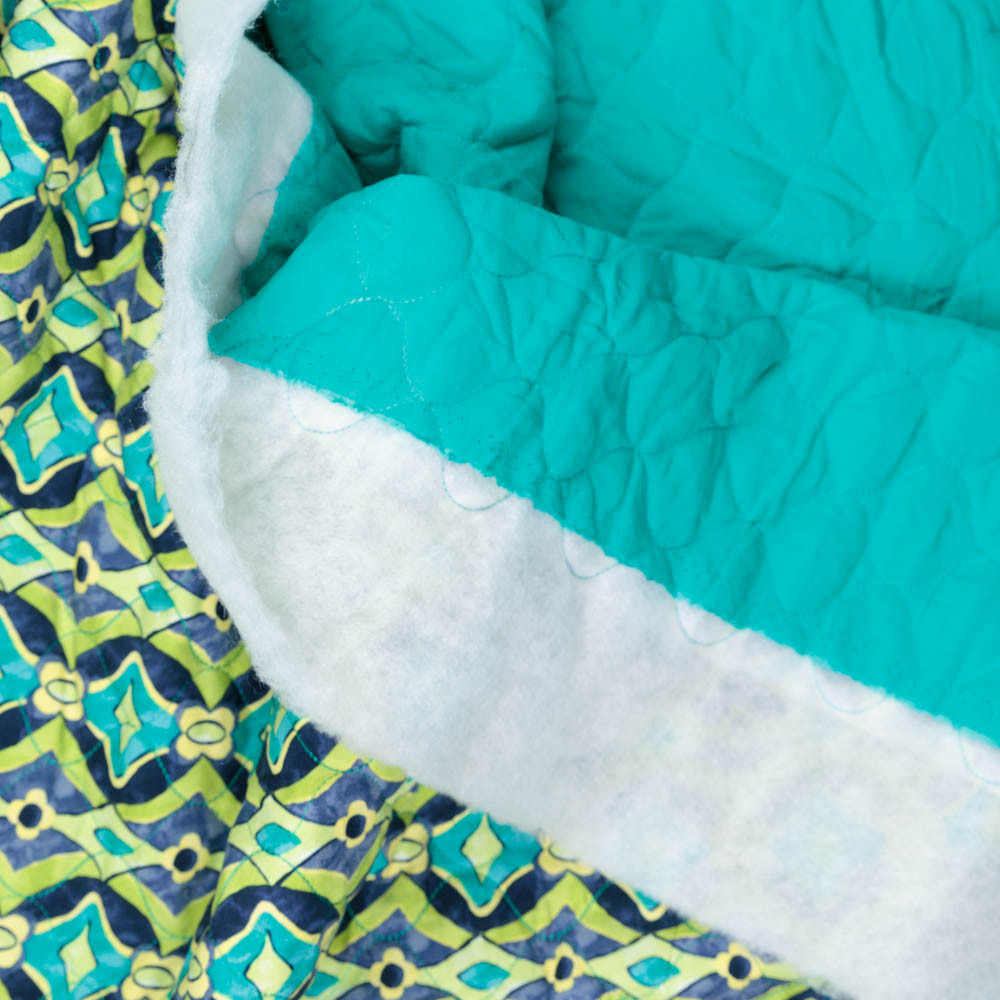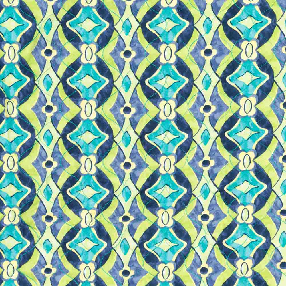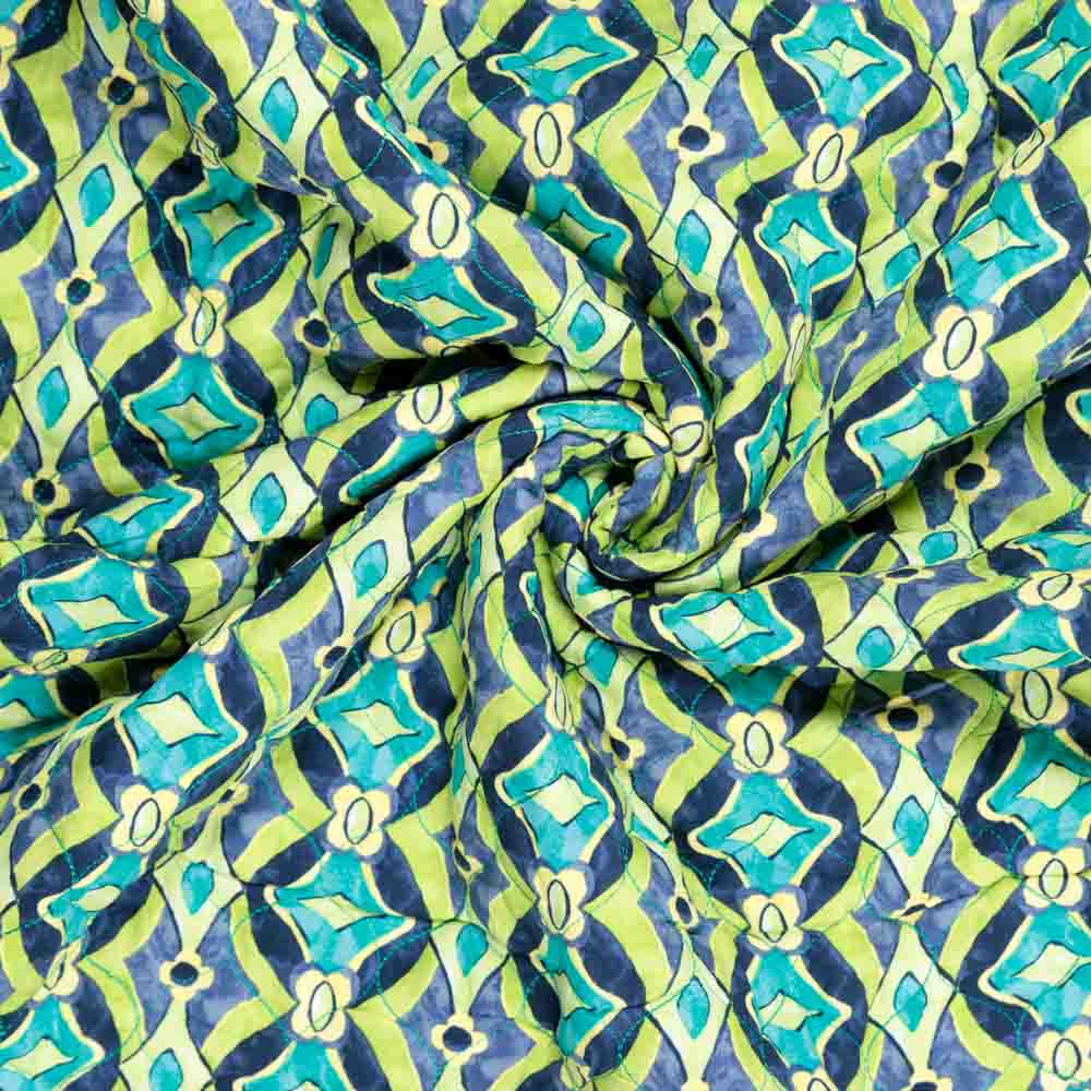 Mid to heavy weight quilted viscose with a structured drape and built-in wadding for warmth and body. The outer face showcases a striking geometric lattice quilting in fresh pistachio, turquoise, and navy tones, while the reverse offers a smooth plain turquoise finish for versatile styling. Fully opaque and perfect for creating quilted jackets, gilets, and statement outerwear with a modern, colour-pop edge.